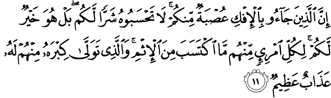Pickthall Lo! they who spread the slander are a gang among you. Deem it not a bad thing for you; nay, it is good for you. Unto every man of them (will be paid) that which he hath earned of the sin; and as for him among them who had the greater share therein, his will be an awful doom.