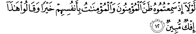 Pickthall Why did not the believers, men and women, when ye heard it, think good of their own own folk, and say: It is a manifest untruth?