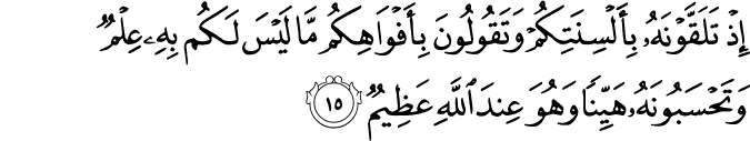 Pickthall When ye welcomed it with your tongues, and uttered with your mouths that whereof ye had no knowledge, ye counted it a trifle. In the sight of Allah it is very great.