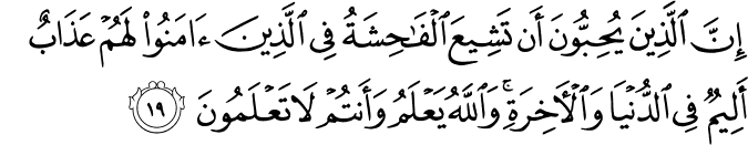 Muhsin Khan Verily, those who like that (the crime of) illegal sexual intercourse should be propagated among those who believe, they will have a painful torment in this world and in the Hereafter. And Allah knows and you know not.