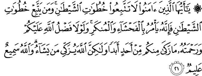 Pickthall O ye who believe! Follow not the footsteps of the devil. Unto whomsoever followeth the footsteps of the devil, lo! he commandeth filthiness and wrong. Had it not been for the grace of Allah and His mercy unto you, not one of you would ever have grown pure. But Allah causeth whom He will to grow. And Allah is Hearer, Knower.