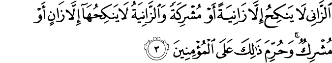 Muhsin Khan The adulterer marries not but an adulteress or a Mushrikah and the adulteress none marries her except an adulterer or a Muskrik [and that means that the man who agrees to marry (have a sexual relation with) a Mushrikah (female polytheist, pagan or idolatress) or a prostitute, then surely he is either an adulterer, or a Mushrik (polytheist, pagan or idolater, etc.) And the woman who agrees to marry (have a sexual relation with) a Mushrik (polytheist, pagan or idolater) or an adulterer, then she is either a prostitute or a Mushrikah (female polytheist, pagan, or idolatress, etc.)]. Such a thing is forbidden to the believers (of Islamic Monotheism).