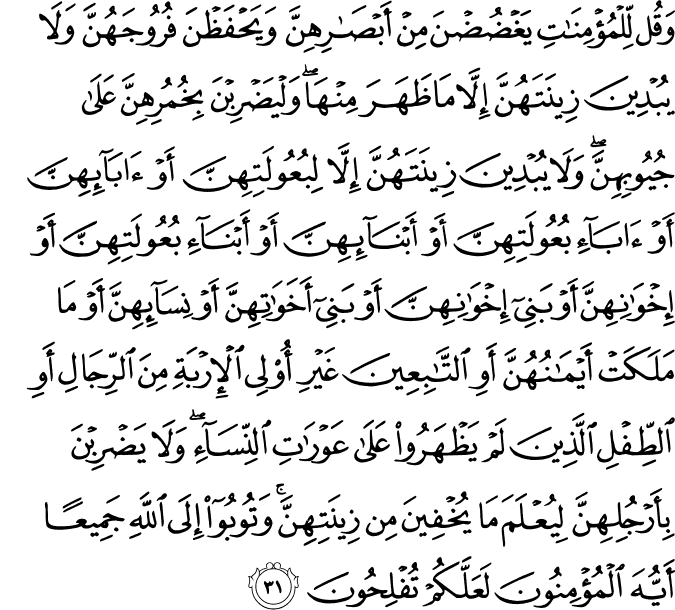 Muhsin Khan And tell the believing women to lower their gaze (from looking at forbidden things), and protect their private parts (from illegal sexual acts, etc.) and not to show off their adornment except only that which is apparent (like palms of hands or one eye or both eyes for necessity to see the way, or outer dress like veil, gloves, head-cover, apron, etc.), and to draw their veils all over Juyubihinna (i.e. their bodies, faces, necks and bosoms, etc.) and not to reveal their adornment except to their husbands, their fathers, their husband's fathers, their sons, their husband's sons, their brothers or their brother's sons, or their sister's sons, or their (Muslim) women (i.e. their sisters in Islam), or the (female) slaves whom their right hands possess, or old male servants who lack vigour, or small children who have no sense of the shame of sex. And let them not stamp their feet so as to reveal what they hide of their adornment. And all of you beg Allah to forgive you all, O believers, that you may be successful.