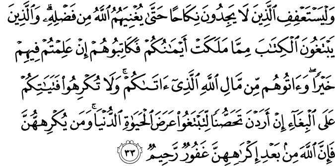 Muhsin Khan And let those who find not the financial means for marriage keep themselves chaste, until Allah enriches them of His Bounty. And such of your slaves as seek a writing (of emancipation), give them such writing, if you know that they are good and trustworthy. And give them something yourselves out of the wealth of Allah which He has bestowed upon you. And force not your maids to prostitution, if they desire chastity, in order that you may make a gain in the (perishable) goods of this worldly life. But if anyone compels them (to prostitution), then after such compulsion, Allah is Oft-Forgiving, Most Merciful (to those women, i.e. He will forgive them because they have been forced to do this evil action unwillingly).