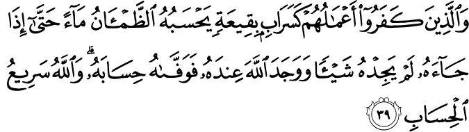 Pickthall As for those who disbelieve, their deeds are as a mirage in a desert. The thirsty one supposeth it to be water till he cometh unto it and findeth it naught, and findeth, in the place thereof, Allah Who payeth him his due; and Allah is swift at reckoning.
