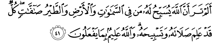 Muhsin Khan See you not (O Muhammad SAW) that Allah, He it is Whom glorify whosoever is in the heavens and the earth, and the birds with wings out-spread (in their flight). Of each one He (Allah) knows indeed his Salat (prayer) and his glorification, [or everyone knows his Salat (prayer) and his glorification], and Allah is All-Aware of what they do.