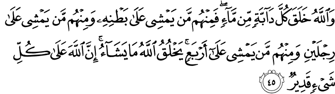 Muhsin Khan Allah has created every moving (living) creature from water. Of them there are some that creep on their bellies, some that walk on two legs, and some that walk on four. Allah creates what He wills. Verily! Allah is Able to do all things.