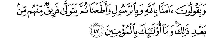 Muhsin Khan They (hypocrites) say: "We have believed in Allah and in the Messenger (Muhammad SAW), and we obey," then a party of them turn away thereafter, such are not believers.