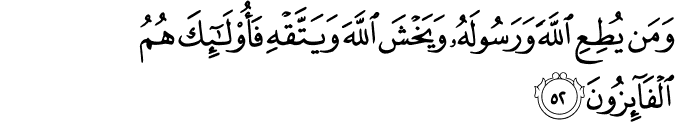 Muhsin Khan And whosoever obeys Allah and His Messenger (SAW), fears Allah, and keeps his duty (to Him), such are the successful ones.