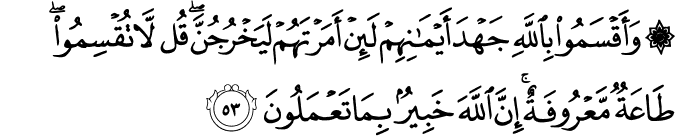 Pickthall They swear by Allah solemnly that, if thou order them, they will go forth. Say: Swear not; known obedience (is better). Lo! Allah is Informed of what ye do.