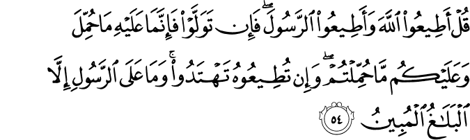 Pickthall Say: Obey Allah and obey the messenger. But if ye turn away, then (it is) for him (to do) only that wherewith he hath been charged, and for you (to do) only that wherewith ye have been charged. If ye obey him, ye will go aright. But the messenger hath no other charge than to convey (the message) plainly.