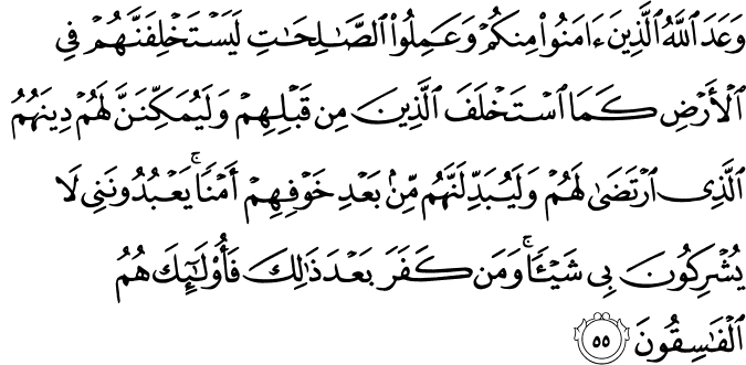 Muhsin Khan Allah has promised those among you who believe, and do righteous good deeds, that He will certainly grant them succession to (the present rulers) in the earth, as He granted it to those before them, and that He will grant them the authority to practise their religion, that which He has chosen for them (i.e. Islam). And He will surely give them in exchange a safe security after their fear (provided) they (believers) worship Me and do not associate anything (in worship) with Me. But whoever disbelieved after this, they are the Fasiqun (rebellious, disobedient to Allah).