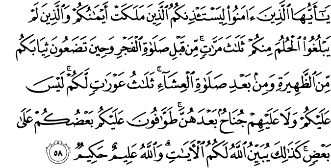 Muhsin Khan O you who believe! Let your legal slaves and slave-girls, and those among you who have not come to the age of puberty ask your permission (before they come to your presence) on three occasions; before Fajr (morning) prayer, and while you put off your clothes for the noonday (rest), and after the 'Isha' (late-night) prayer. (These) three times are of privacy for you, other than these times there is no sin on you or on them to move about, attending (helping) you each other. Thus Allah makes clear the Ayat (the Verses of this Quran, showing proofs for the legal aspects of permission for visits, etc.) to you. And Allah is All-Knowing, All-Wise.