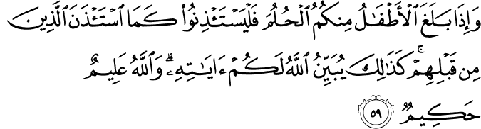 Muhsin Khan And when the children among you come to puberty, then let them (also) ask for permission, as those senior to them (in age). Thus Allah makes clear His Ayat (Commandments and legal obligations) for you. And Allah is All-Knowing, All-Wise.