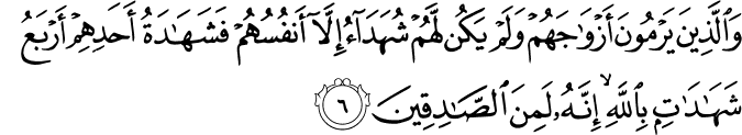 Pickthall As for those who accuse their wives but have no witnesses except themselves; let the testimony of one of them be four testimonies, (swearing) by Allah that he is of those who speak the truth;