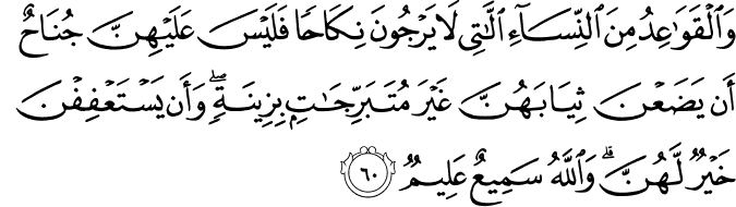 Muhsin Khan And as for women past child-bearing who do not expect wed-lock, it is no sin on them if they discard their (outer) clothing in such a way as not to show their adornment. But to refrain (i.e. not to discard their outer clothing) is better for them. And Allah is All-Hearer, All-Knower.