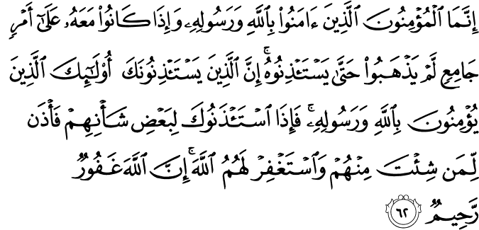 Muhsin Khan The true believers are only those, who believe in (the Oneness of) Allah and His Messenger (Muhammad SAW), and when they are with him on some common matter, they go not away until they have asked his permission. Verily! Those who ask your permission, those are they who (really) believe in Allah and His Messenger. So if they ask your permission for some affairs of theirs, give permission to whom you will of them, and ask Allah for their forgiveness. Truly, Allah is Oft-Forgiving, Most Merciful.