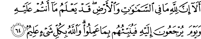 Pickthall Lo! verily unto Allah belongeth whatsoever is in the heavens and the earth. He knoweth your condition. And (He knoweth) the Day when they are returned unto Him so that He may inform them of what they did. Allah is Knower of all things.