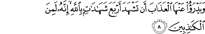 Muhsin Khan But it shall avert the punishment (of stoning to death) from her, if she bears witness four times by Allah, that he (her husband) is telling a lie.